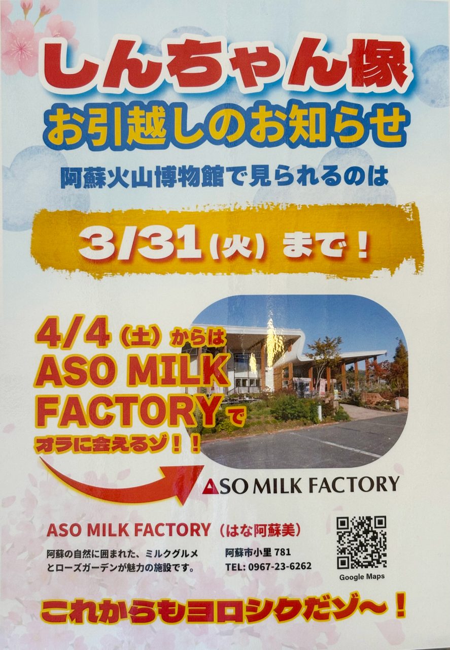 現在、阿蘇火山博物館 に設置されていますが、3月31日(火)までの展示となり、4月4日(土)からはASO MILK FACTORYへ移設されます。
