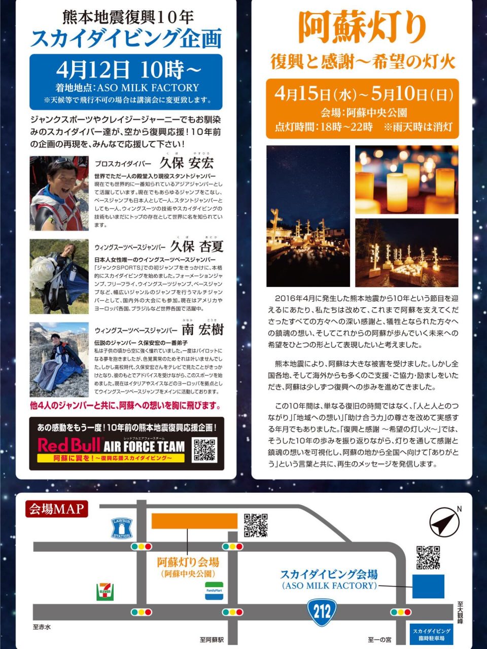 2026.04.10 EVENT 熊本地震復興10年イベントのご案内 熊本地震から10年という節目を迎えるにあたり、テレビ番組「ジャンクSPORTS」や「クレイジージャーニー」でおなじみのスカイダイバーたちが阿蘇の空を舞うスカイダイビング企画や、10年の歩みを振り返りながら、灯りを通して感謝と鎮魂の想いを形にする「阿蘇灯り」が開催されます。 阿蘇の地から全国へ、「ありがとう」の言葉とともに、復興と再生へのメッセージを発信します。