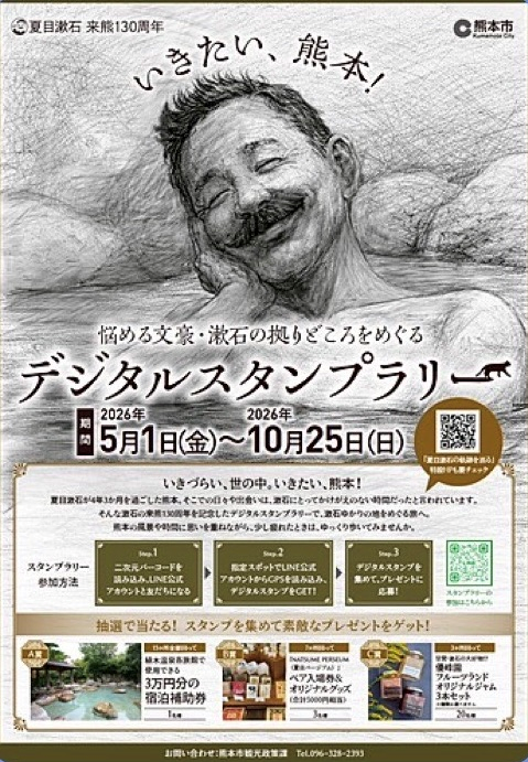 この度、新たにスタートする「夏目漱石来熊130周年 いきたい、熊本! 悩める文豪・漱石の拠りどころをめぐるデジタルスタンプラリー」として生まれ変わることになりました(スタンプラリー開始は2026年5月1日〜)。