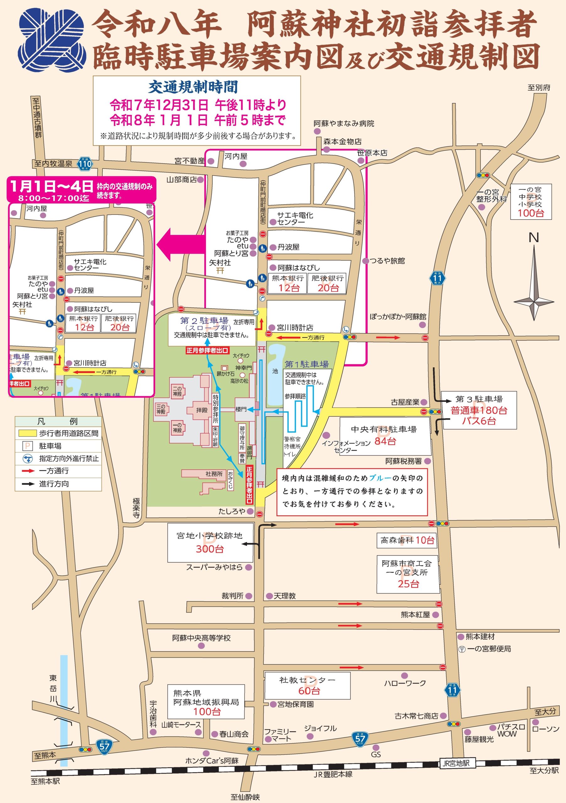 阿蘇神社の初詣に伴う臨時駐車場及び交通規制のご案内です。